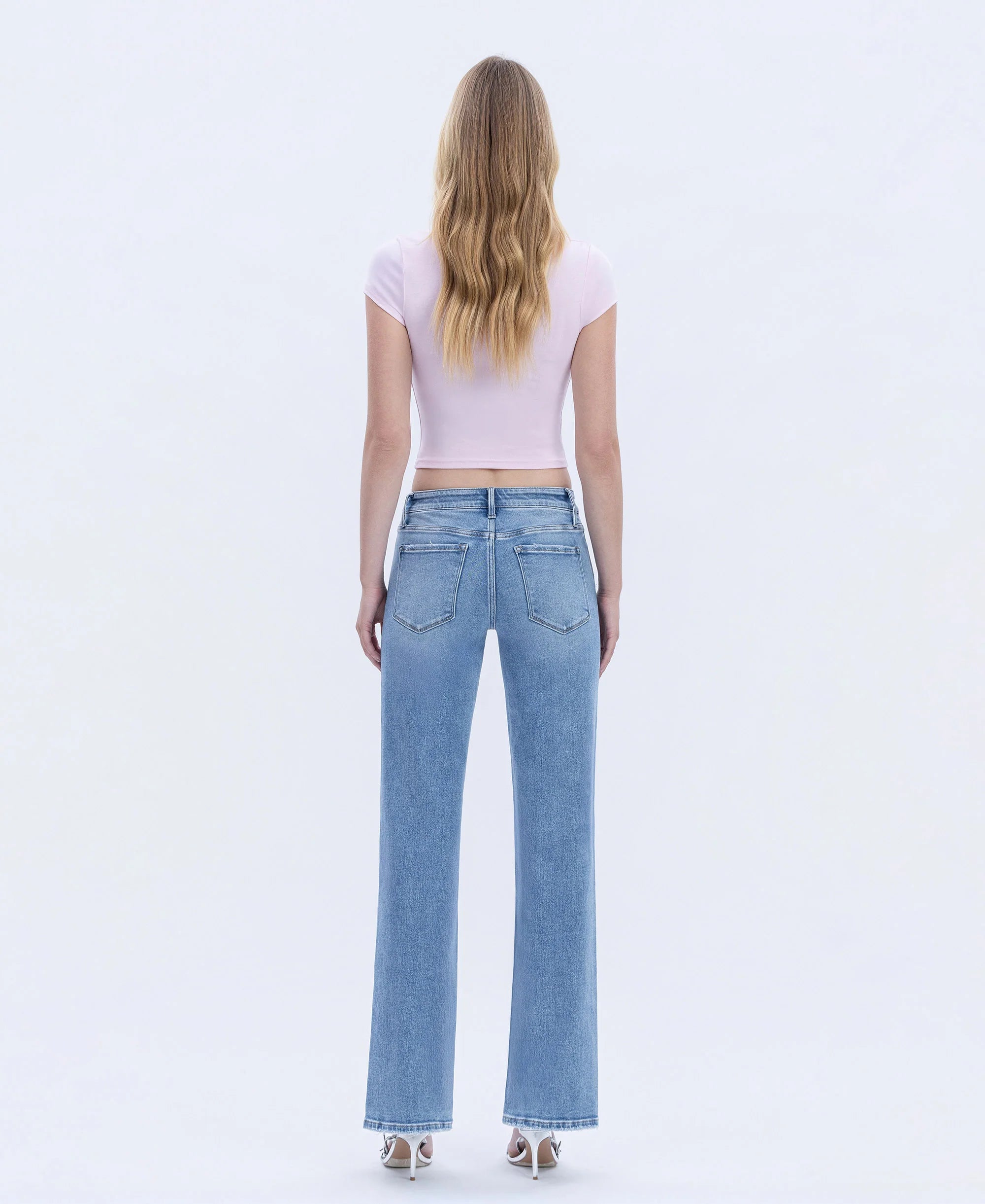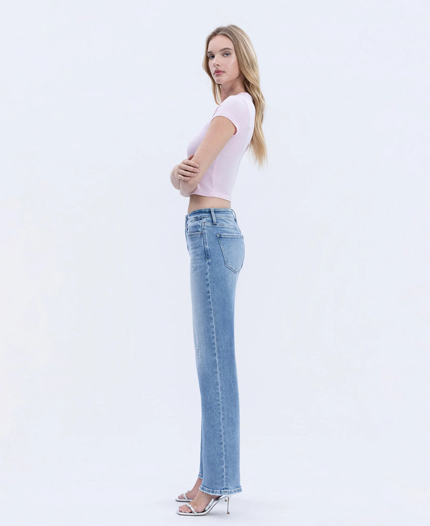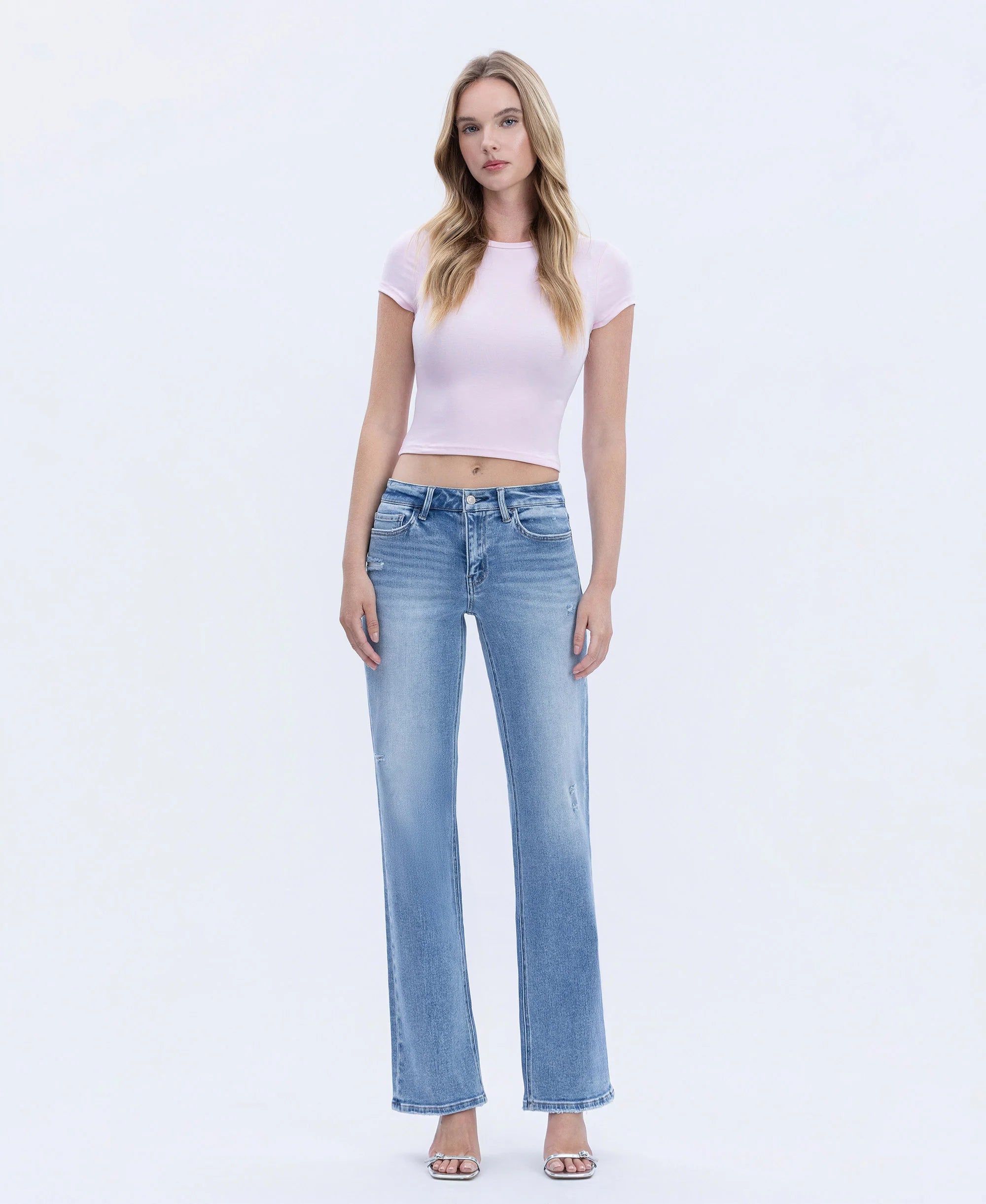 Made from stretchy denim with a mid rise waist, these jeans offer a playful silhouette featuring full length slim wide legs. Lightly distressed detailing adds a touch of edge, while finished hems keep your look polished and fresh.