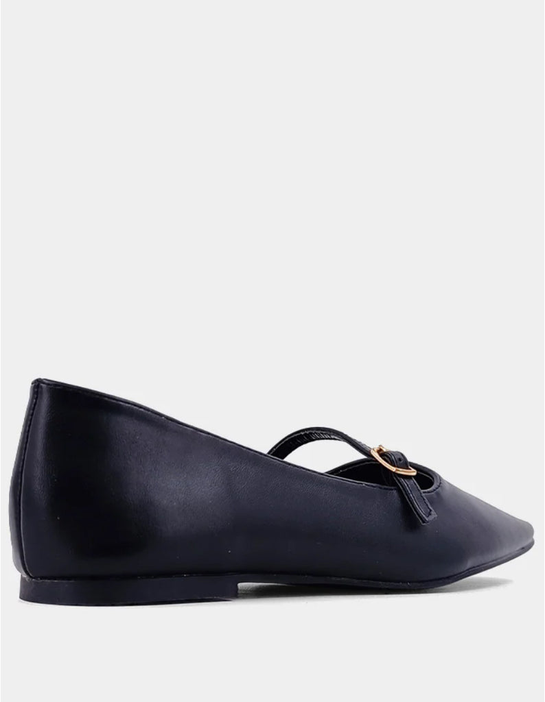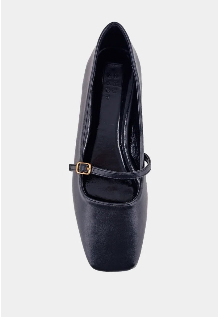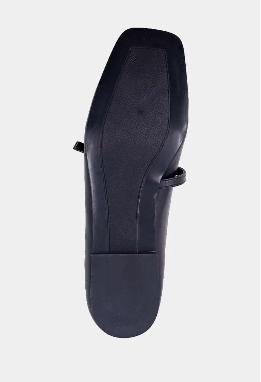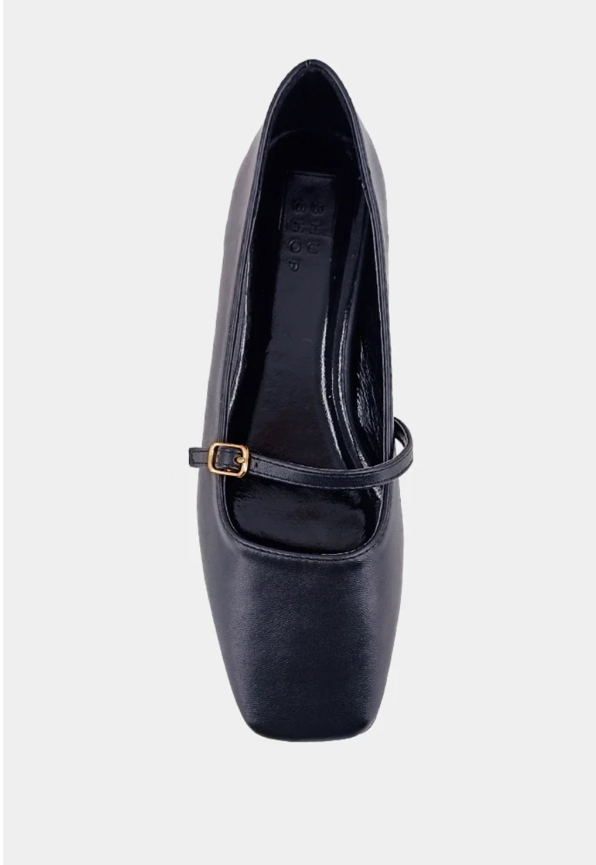 ADELE is a classic and versatile shoe that adds a touch of elegance to any ensemble. The ballet flats are comfortable and stylish, marking the return of a beloved trend. Made from supple faux black leather, the shoes feature a charming Mary Jane shape with square toes and a slender buckle-fastening strap. Their timeless design makes them a perfect match for a wide range of outfits, adding a sophisticated flair to any look.
