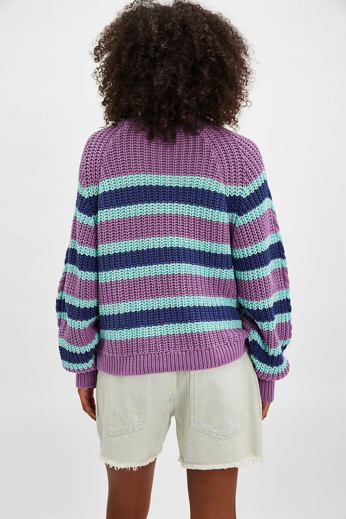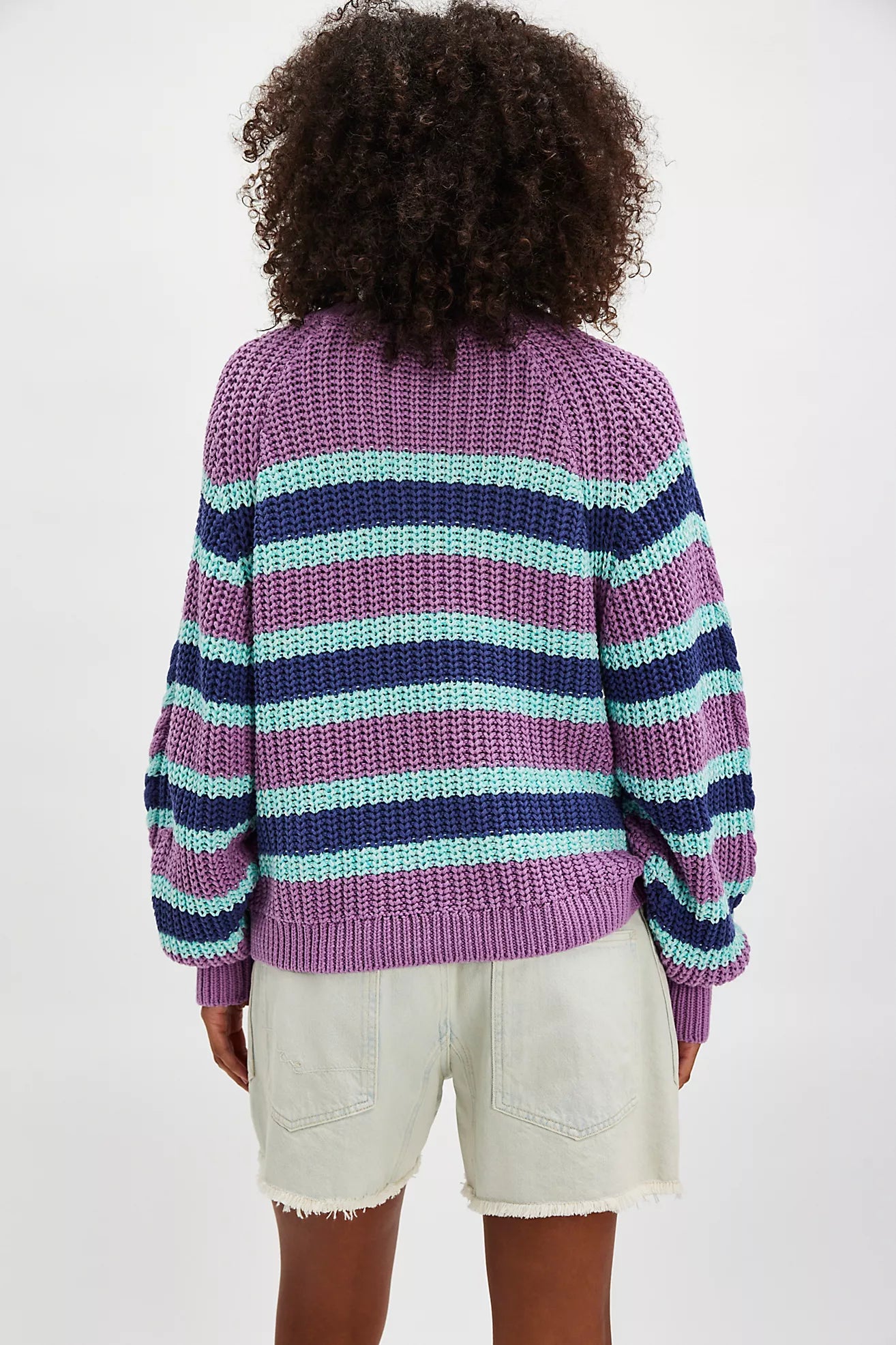 Nothing’s better than the perfect chunky sweater–this striped option is featured in a cropped, boxy style and classic cable knit for endless layering throughout the year.