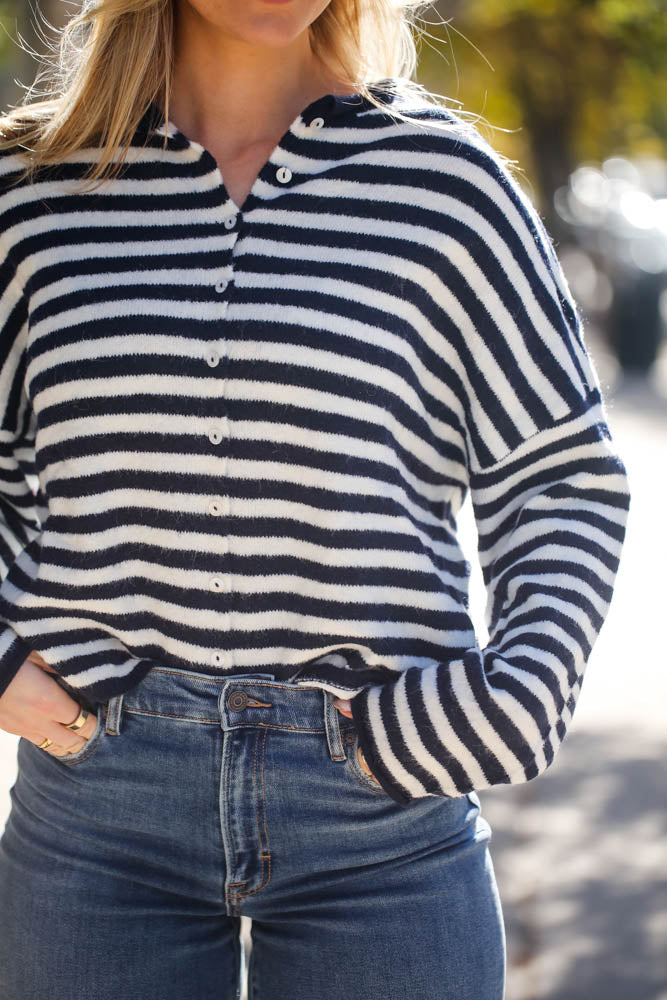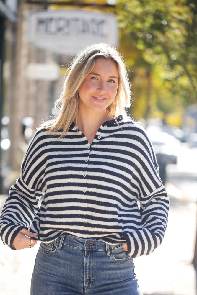 Piper Striped Cardigan-Navy - S is backordered and will ship as soon as it is back in stock.