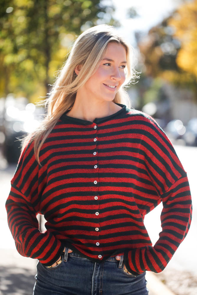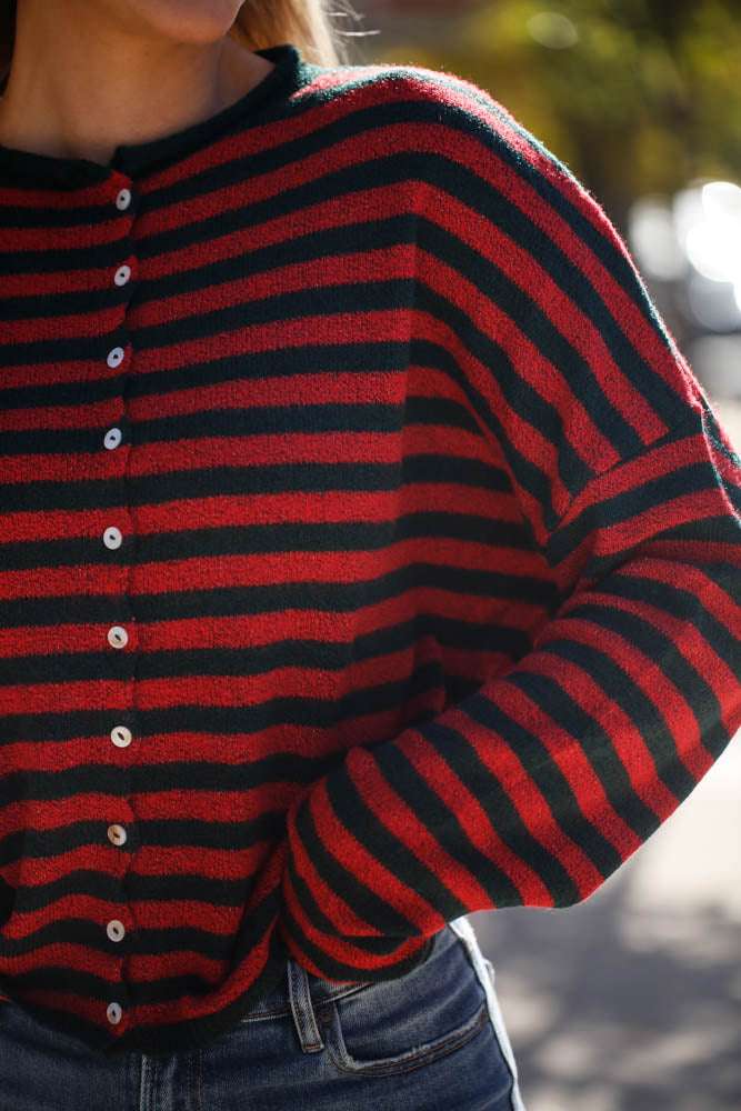Piper Striped Cardigan-Red - S is backordered and will ship as soon as it is back in stock.