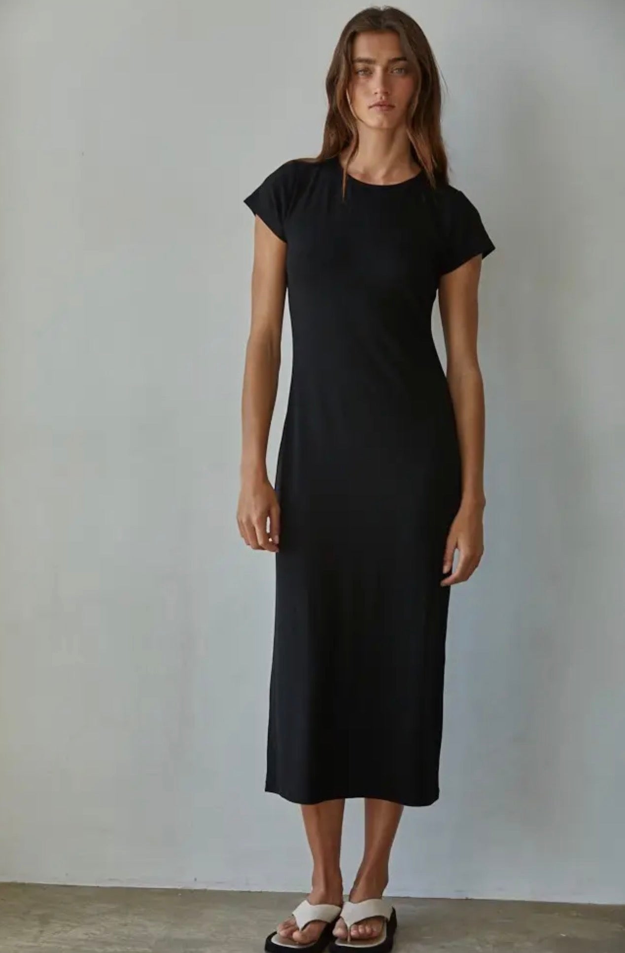 The Bodycon Midi Dress is crafted from a blend of knit rayon and spandex, ensuring a comfortable fit that conforms to the body's shape. Its short sleeves and midi length provide a balance of style and modesty, making it suitable for various occasions. The black color enhances versatility, allowing for easy pairing with accessories or outerwear.