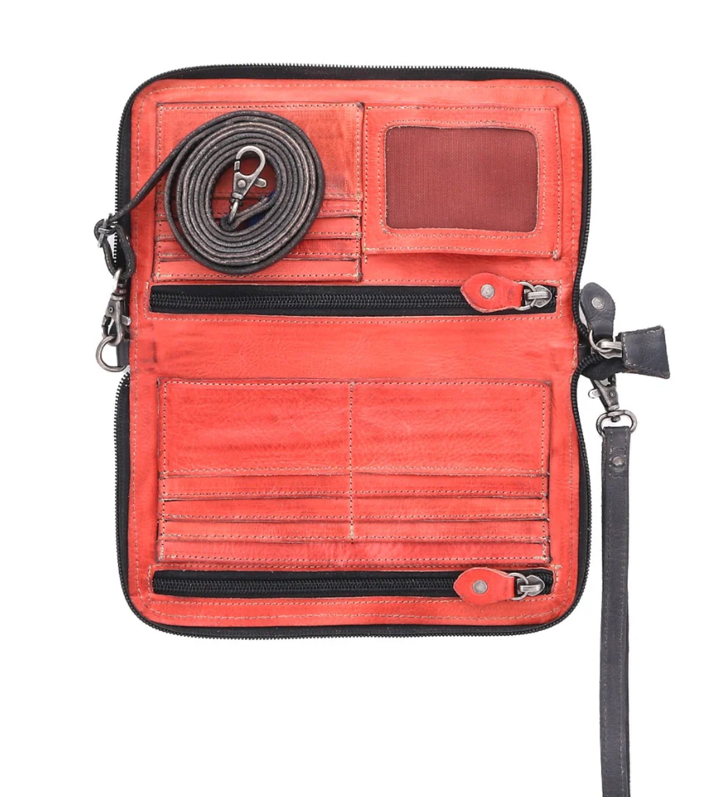 This three-in-one leather wallet, clutch, and crossbody, adorned with beautifully hand-applied finishes, is your go-to accessory for style and organization.