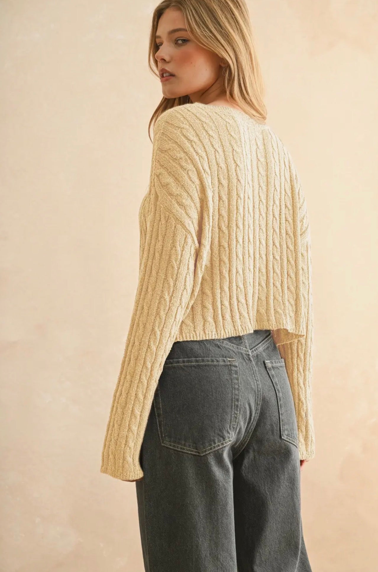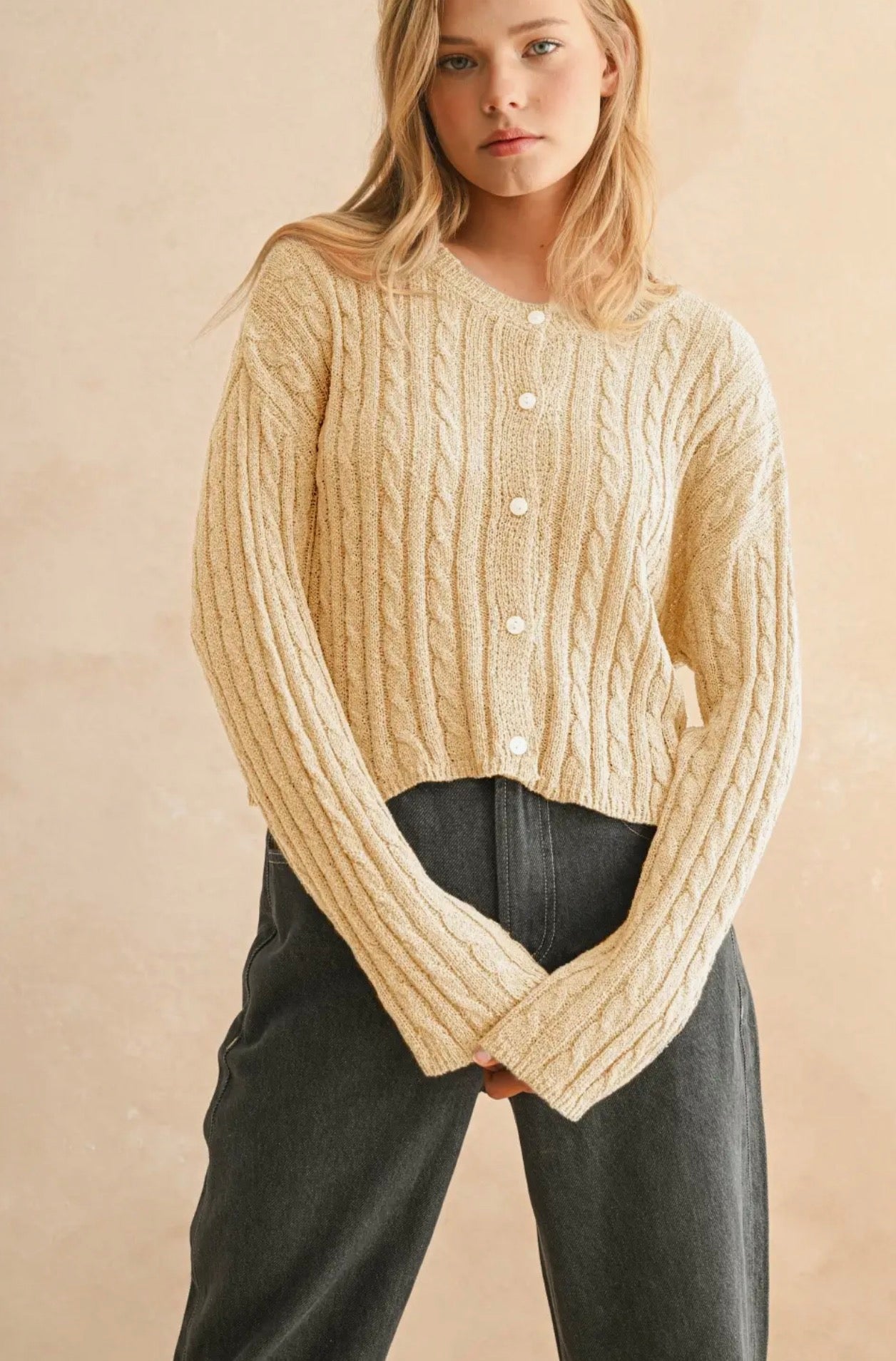 The Connie Cable Cardi is a lightweight, cropped cardigan crafted from cable-knit fabric in a versatile beige shade. Its lightweight design allows for comfortable wear in varying climates, while the cropped length enhances mobility and styling options. Ideal for layering, it combines functionality with aesthetic appeal.