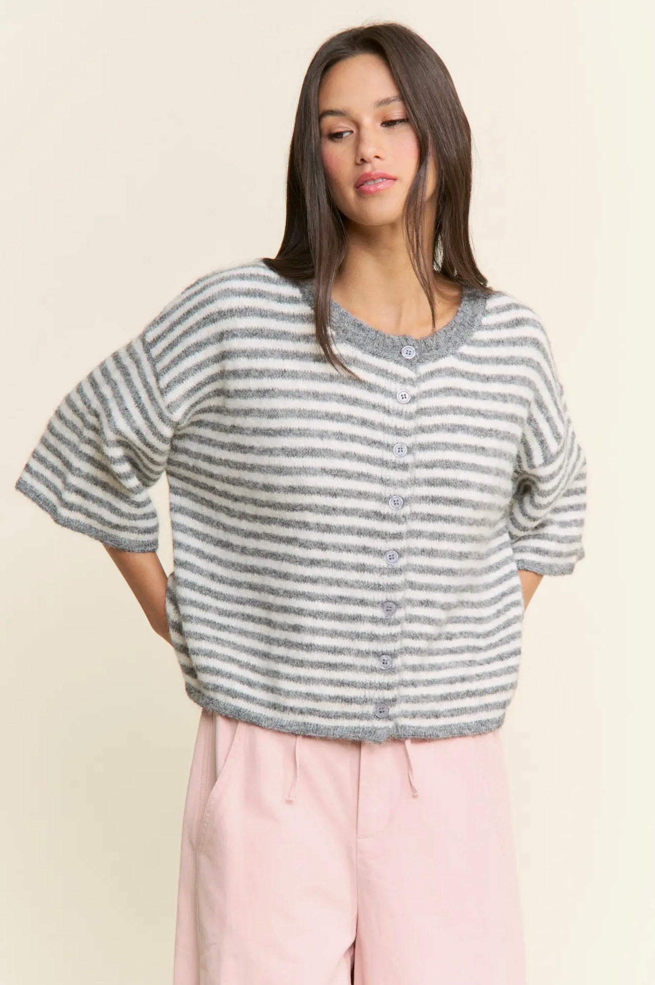The Lou Cardigan is a cropped soft knit piece featuring a striped design in grey and ivory. Its lightweight fabric offers comfort while maintaining warmth, making it suitable for layered outfits. The cropped cut enhances versatility, allowing for effortless styling across various occasions.