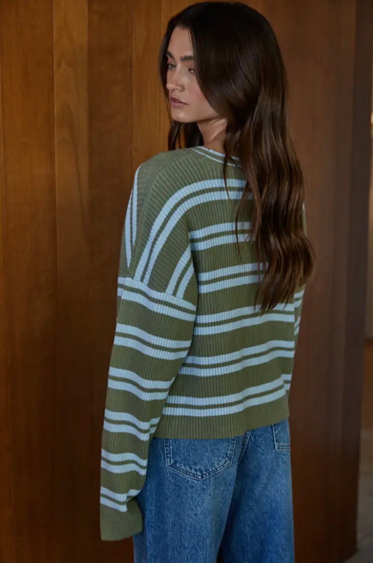 The Nessa Striped Sweater in Olive is designed for transitional weather, featuring a classic stripe pattern that offers both style and versatility. Constructed from breathable materials, it provides comfort while effectively regulating body temperature, making it suitable for varying climates.