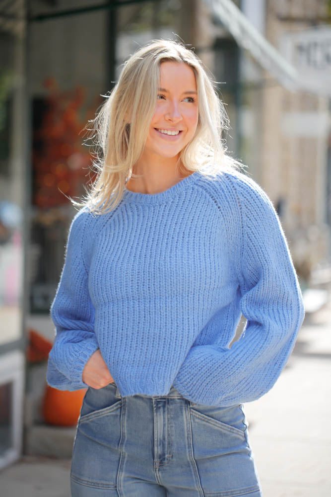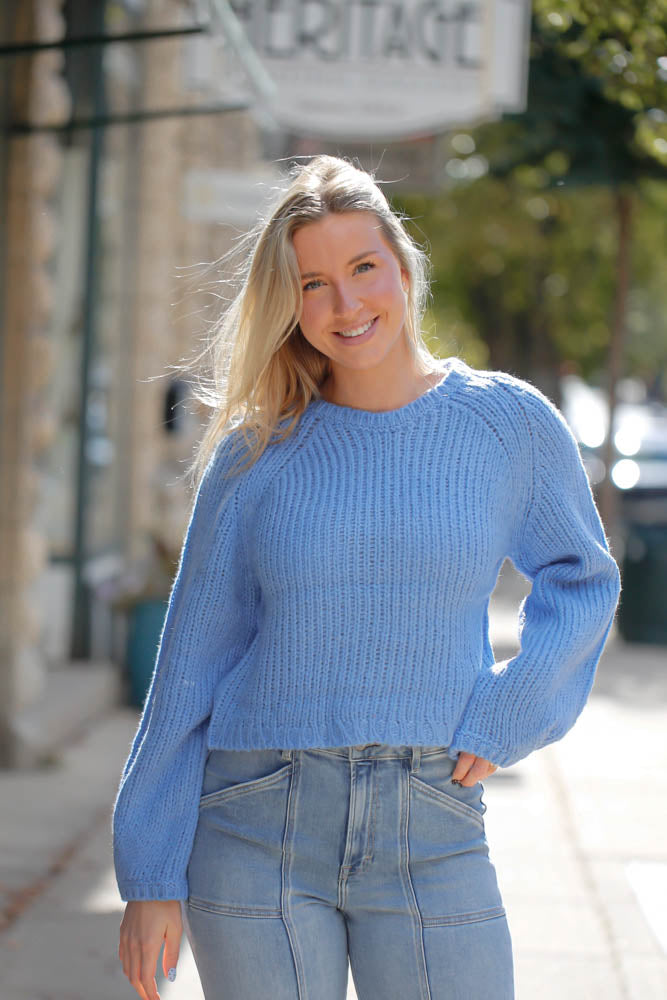 "Introducing the Sheena Sweater in Serena Blue- a must-have for staying cozy this season. With its thick and warm material, this cropped sweater provides comfort and style. Perfect for layering or wearing on its own, the Sheena Sweater is a versatile addition to any wardrobe."