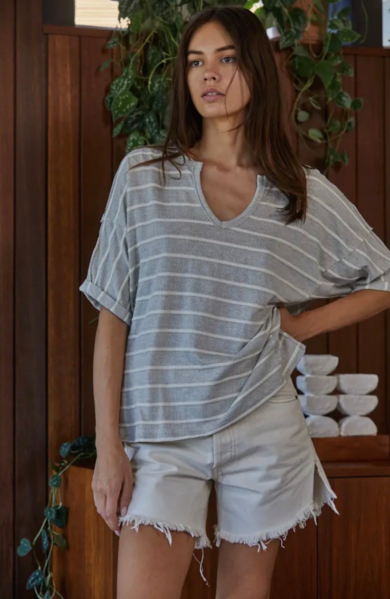 The Simply Striped Top features a striped v-neck design crafted from a comfortable knit fabric, available in a cream and grey color scheme. The side slits enhance breathability and mobility, making it suitable for both casual and semi-formal settings. This top offers a versatile addition to any wardrobe.